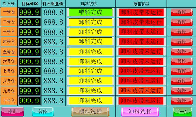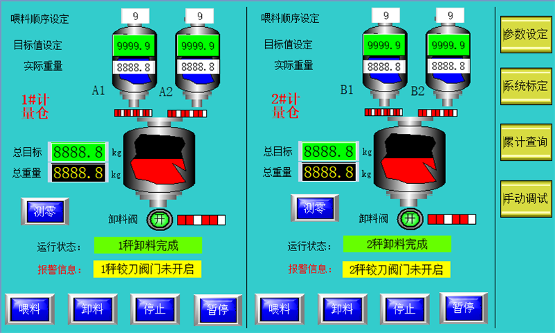 設(shè)置多個(gè)獨(dú)立儲(chǔ)料倉(cāng)和多個(gè)獨(dú)立計(jì)量倉(cāng),對(duì)每種需要計(jì)量的物料預(yù)先按照各自配方進(jìn)行喂料控制(分為高速喂料和低速喂料、提前量控制)進(jìn)入計(jì)量倉(cāng)內(nèi),等待生產(chǎn)需要時(shí)可以直接同步進(jìn)行卸料。